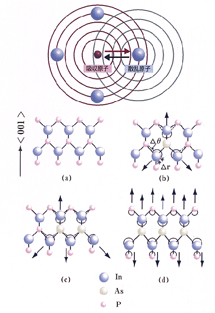 波長可変の大強度で方向性のそろった光「シンクロトロン放射光」は、様々な材料の原子構造、電子状態を測定・解析することに広く利用されています。特にX線は、その波長が原子の大きさと同程度であることから、原子スケールでの微視的又は局所的な情報を得ることが可能です。X線を利用した表面・界面の構造解析手段の一つに、広域X線吸収端微細構造(EXAFS)法があります。EXAFS法は、原子がX線を吸収する際に発生する光電子の進行波と、近傍の原子により散乱された光電子波の干渉の結果、遷移モーメントが変調されて微細構造が生じる現象を利用して物質の局所構造を調べる手法で、中心原子の種類を選択し、中心原子の周囲の原子の数とそこまでの距離を精度よく決定することができるという特徴があります。EXAFS法により解析された局所構造の例として、InP基板上に成長させた一原子層InP1-xAsx超薄膜においてAsの組成比を増加させたときの、超薄膜中界面付近の結合長緩和の様子を示します。