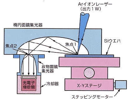 収束レーザー光を走査しながら照射し、超精密加工表面上の微粒子からのレーリー散乱光を楕円面鏡で集めて検出し、その粒径をナノメータオーダで測定する新しい方法です。図に示すように、シリコンウエハを計測し、粒径19nmに相当する信号を検出しています。これは、従来に比べて1オーダ以上検出感度を高めたことになります。シリコンウエハや放射光用ミラー等の超精密加工表面の微粒子を検査し、さらに散乱光から表面マイクロラフネスを推定し、加工表面を総合的に評価します。